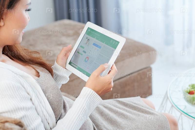 беременная молодая женщина общается со своим врачом через приложение для здоровья на планшетном компьютере