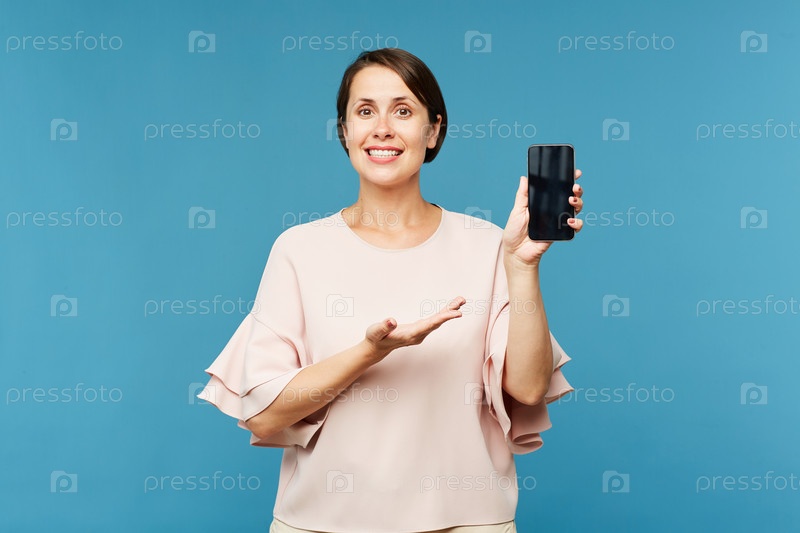 Счастливая молодая элегантная женщина в белой блузке, показывающая рекламу на смартфоне