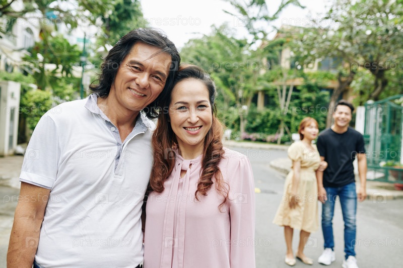 Зрелая азиатская пара обнимается,