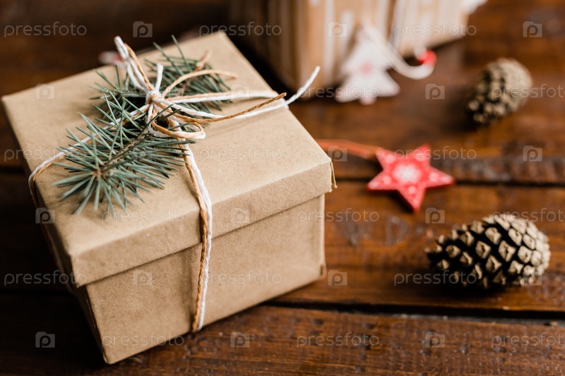 Упакованная и упакована подарочная коробка с хвойными деревьями наверху на деревянном столе