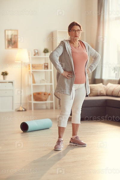 Портрет серьезной пожилой женщины в спортивной одежде и очках, которая стоит в гостиной и держит руки за бедра