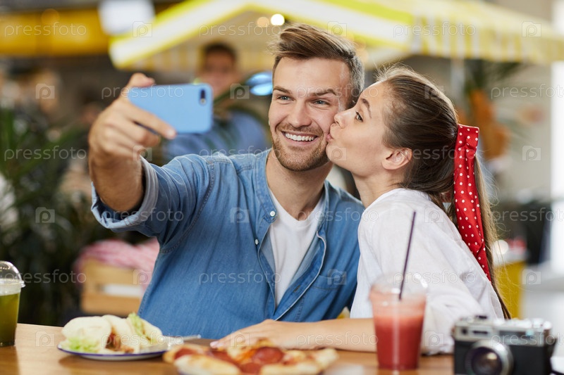 Красивая молодая женщина с красной пунктирной лентой в волосах сидит за столом и целует парня для селфи
