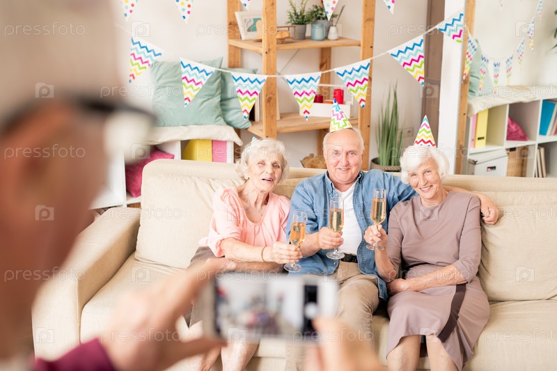 Три старших друга с флейтами шампанского сидят на диване