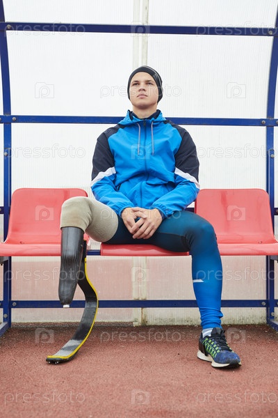 Серьезный молодой мотивированный спортсмен в синей куртке с бегущим лезвием, сидящий на скамейке и смотрящий вдаль