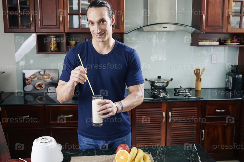 Мужчина пьет молочный коктейль