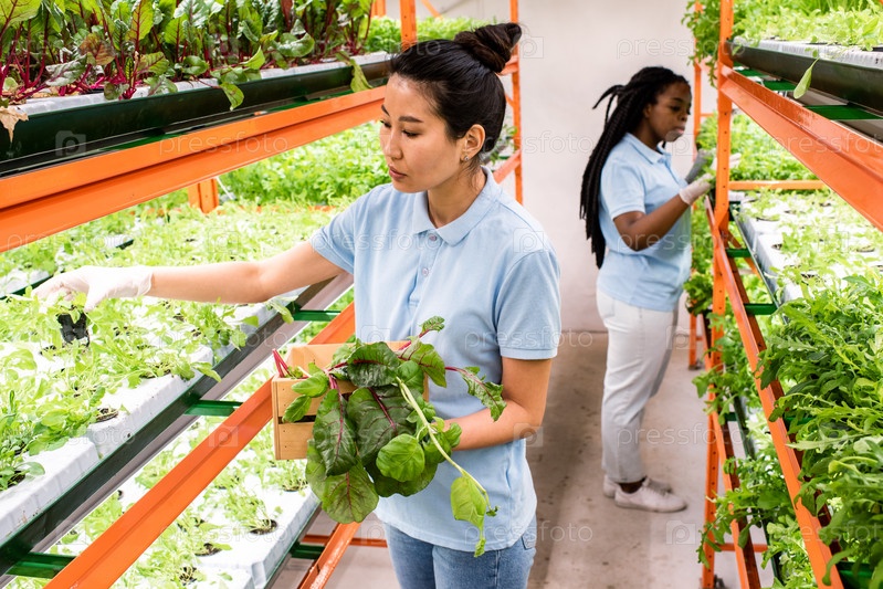 Две молодые межкультурные работницы теплиц, заботящиеся о зеленых саженцах