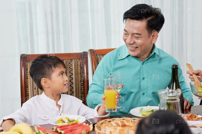 Говорящий взрослый мужчина с ребенком на семейном ужине