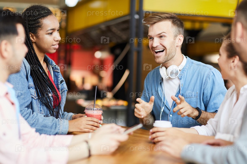 Эмоциональный красивый хипстер-мужчина с наушниками на шее сидит за столом и рассказывает историю друзьям в кафе