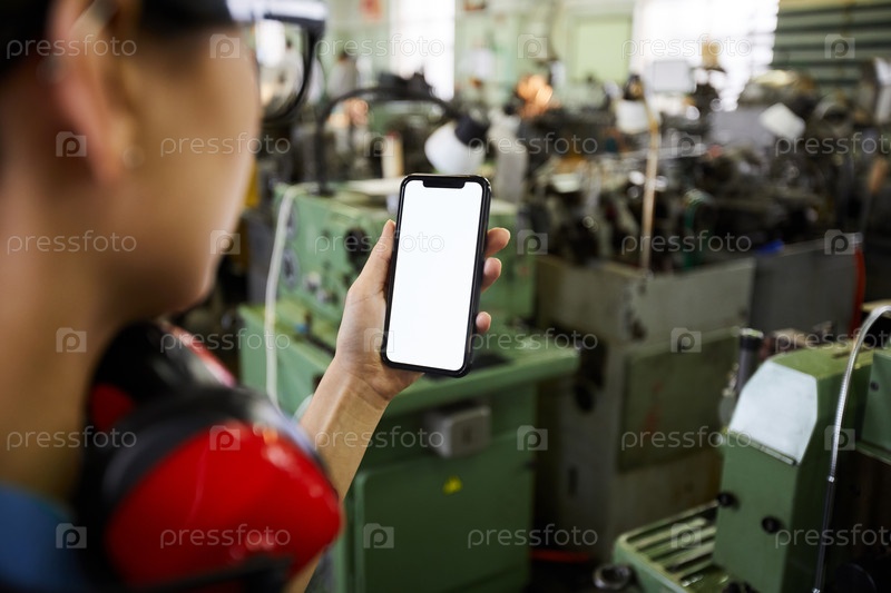 Близкий план женщины-инженера, использующей смартфон во время фотографирования рабочего места фабричного магазина