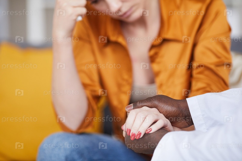 Близкий план неузнаваемого мужчины Черный психолог, держащий руку отчаявшейся пациентки, поддерживая ее на сеансе терапии