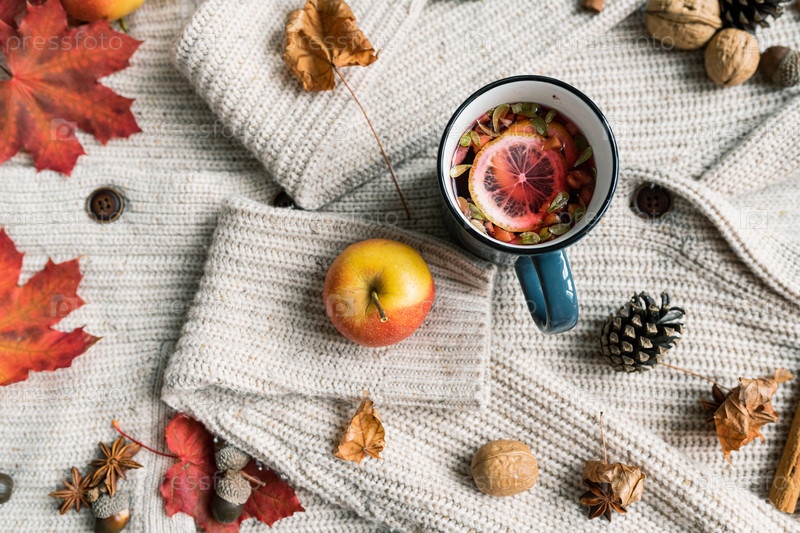 Зрелое яблоко, кружка горячего травяного чая с лимоном, сухими листами, конусом, орехами и пряностями