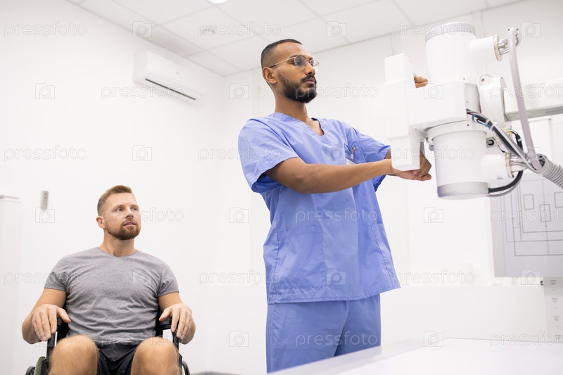 Молодой спортсмен в инвалидном кресле смотрит на врача, тестирующего новое медицинское оборудование