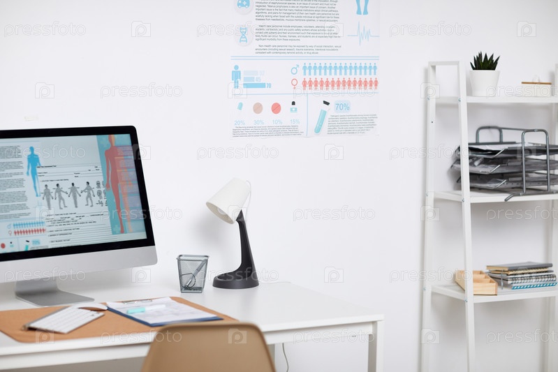 Офис современных врачей украшен красочным баннером на стене, полками файлов и компьютером с картинками схемы тела