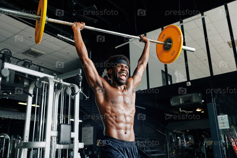 Кричащий мужчина поднимает тяжелую штангу