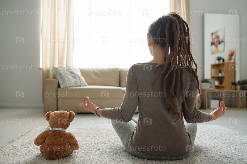 Молодая самка сидит в позе лотоса на полу и коричневого плюшевого медведя рядом