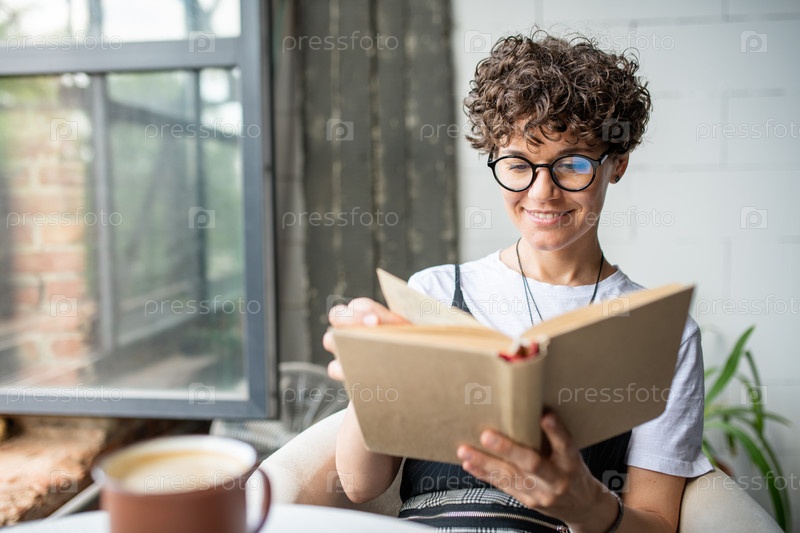 Молодая улыбающаяся женщина читает книгу, отдыхая в кресле