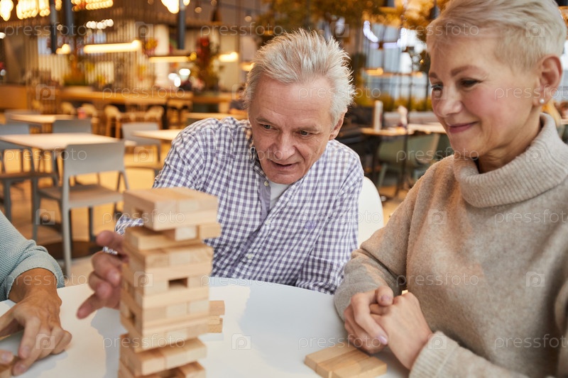 Группа сконцентрированных старших друзей, сидящих за столом в комнате отдыха дома престарелых и играющих в дженгу