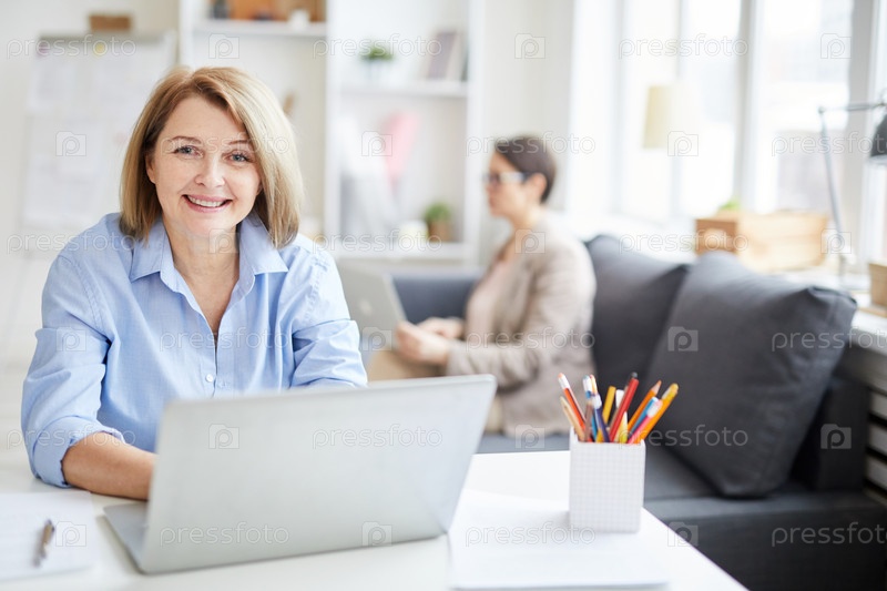 Взрослая женщина наслаждается работой в офисе