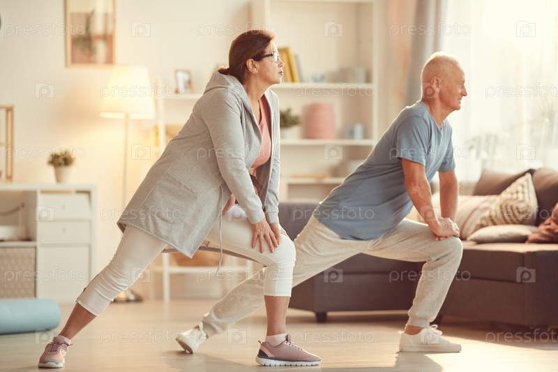 Энергичная старшая пара в спортивной одежде, опирающаяся на колени во время растяжки ног на домашней тренировке