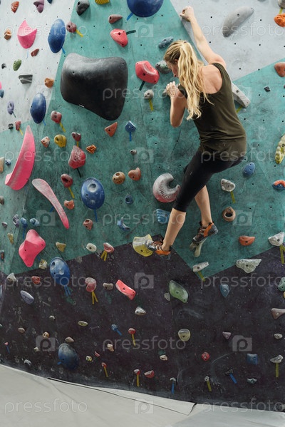 Молодая активная самка, которая держит искусственные скалы на стене во время практики восхождения