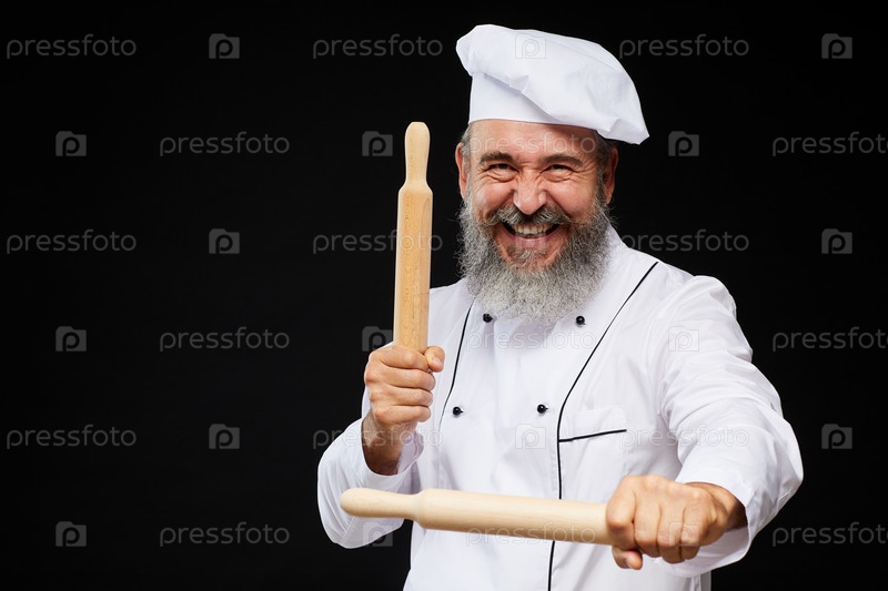 Веселый старший пекарь позирует на черном