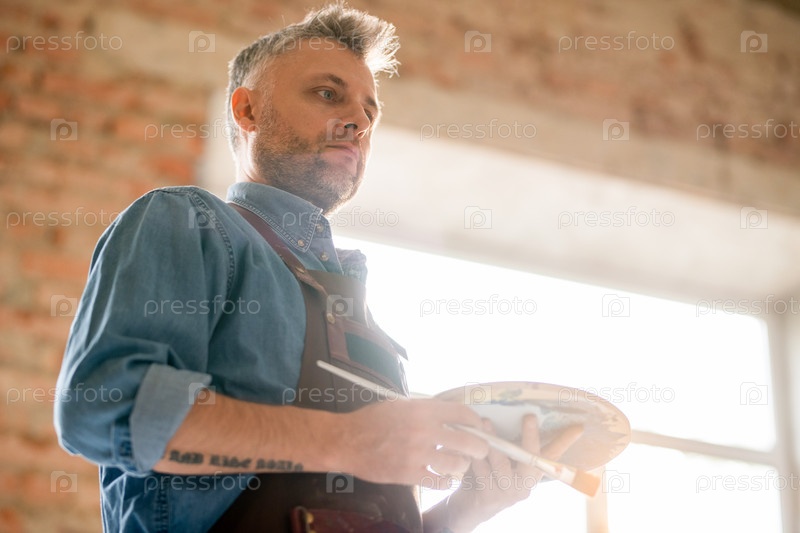 Вдумчивый или серьезный мужчина средних лет в рабочей одежде, думающий об идеях на работе