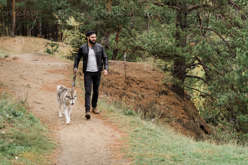 Молодой человек в повседневной одежде идет по тропинке, держась за поводок своей собаки