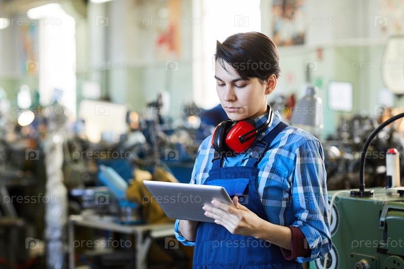 Серьезная заботливая леди-работница с короткими черными волосами, стоящая в заводском магазине часового завода и проверяющая информацию на планшете