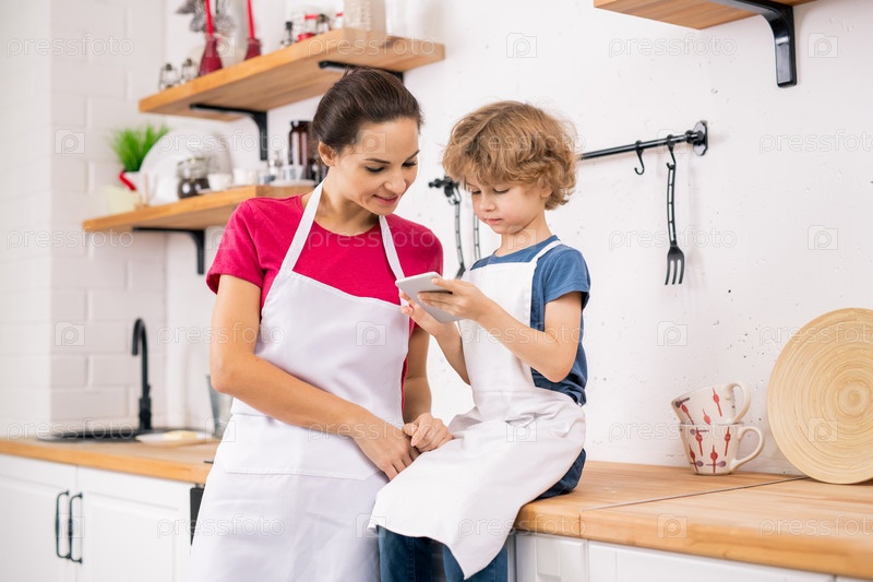 Кудрявый блондин в фартуке показывает рецепт своей матери на смартфоне