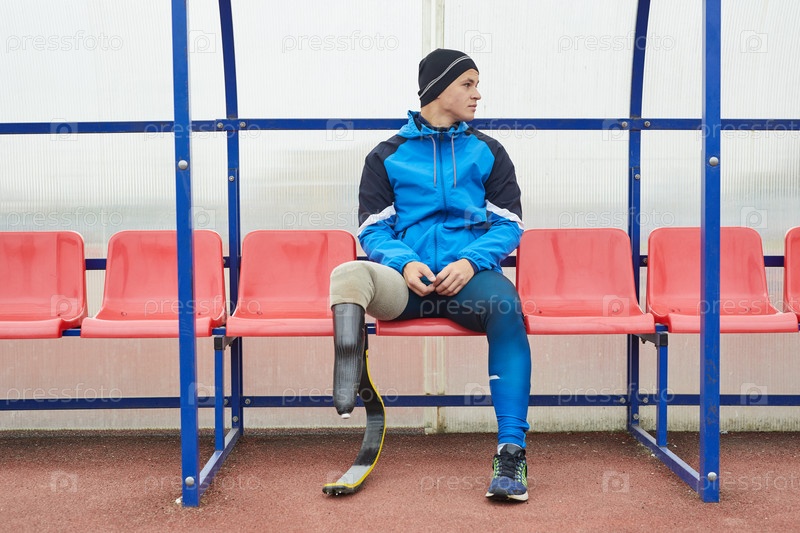 Серьезный молодой паралимпийский мужчина в беговом лезвии, одетый в голубую спортивную куртку и шляпу сидит на боковой линии и смотрит наружу