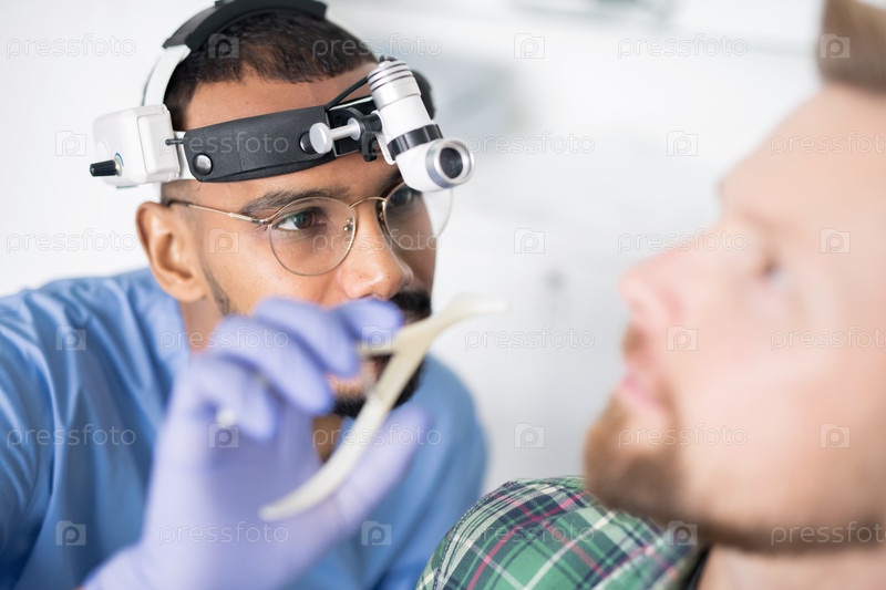 Молодой врач в перчатках и форме собирается осмотреть больное ухо пациента