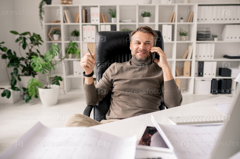 Веселый зрелый архитектор или бизнесмен со смартфоном, разговаривающий с клиентом