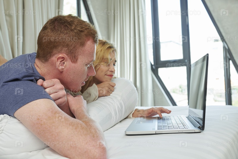 Пара отдыхает с ноутбуком в постели