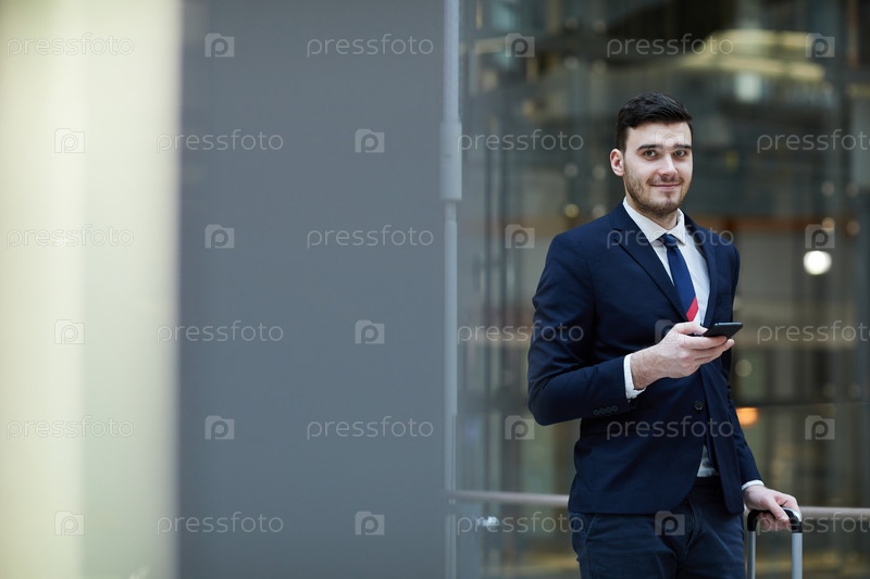 Контент уверенный в себе красивый молодой стюард, держащий ручку багажа и использующий смартфон при взгляде на камеру