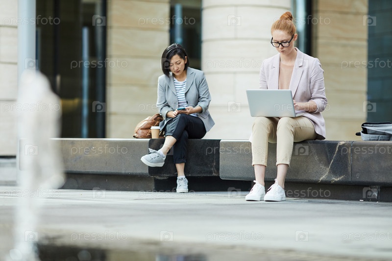Молодые люди используют мобильные устройства на открытом воздухе