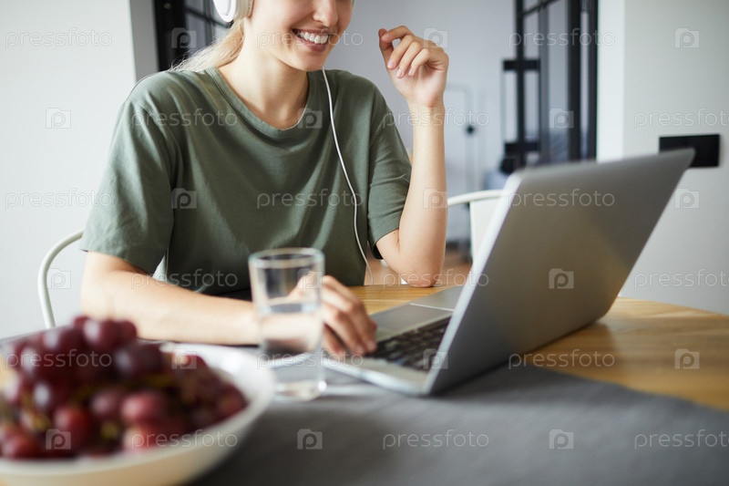 Улыбающаяся молодая женщина в сети перед ноутбуком