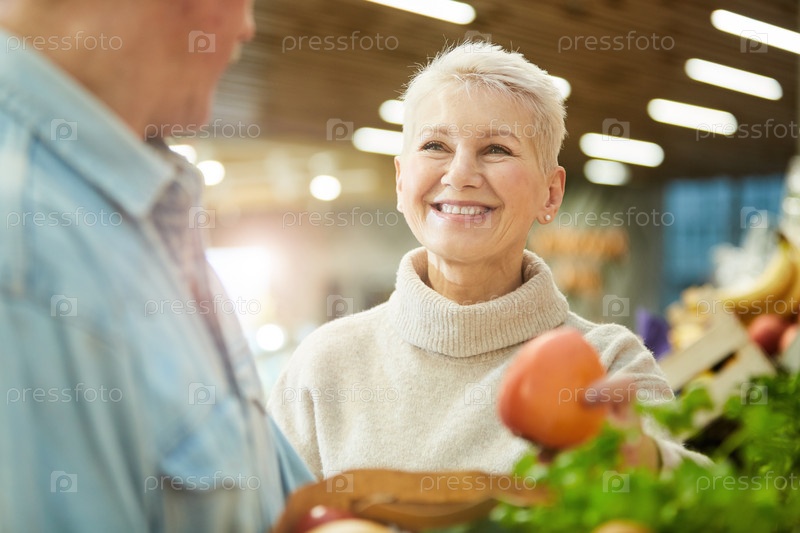 Улыбающаяся старшая женщина Покупает продукты на рынке