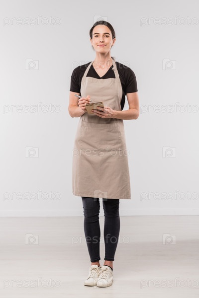 Красивая брюнетка-официантка в рабочей одежде делает заметки в маленьком блокноте