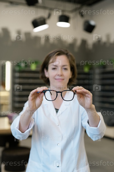 Молодая профессиональная акушерка-оптимистка в белом пальто, держащая пару очков