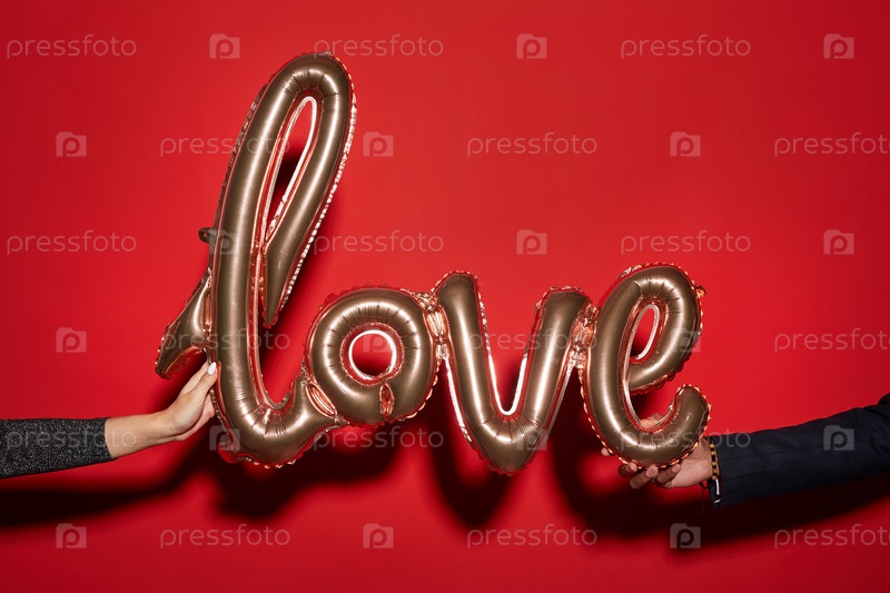 Пара, держащая слово 'ЛЮБОВЬ' на красной паре