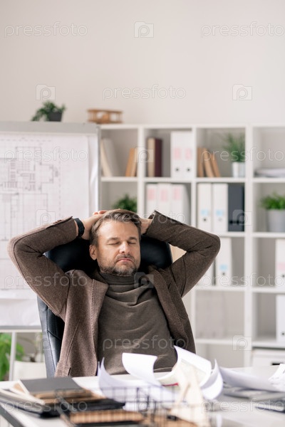 Зрелый инженер в формальной одежде, сидящий на кресле с руками за спиной