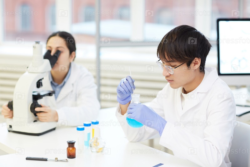 Концентрированный молодой азиатский работник лаборатории в очках и стерильных перчатках, сидящий за столом и работающий с циановой жидкостью