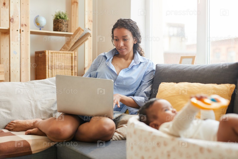 Молодая мать, использующая ноутбук