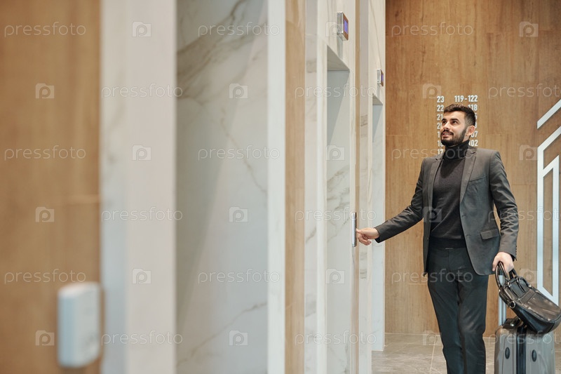 Современный бизнес-путешественник в костюме, нажимающий кнопку лифта на стене