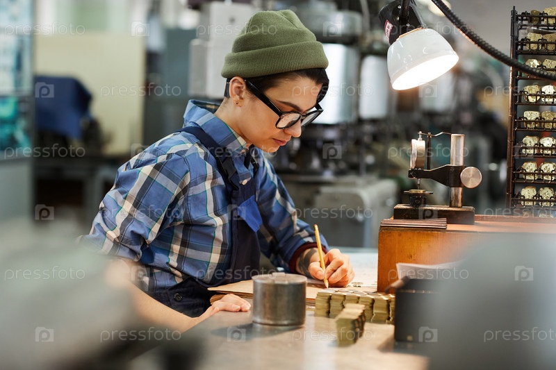 Серьезно сконцентрированная женщина-инженер часовой фабрики в очках сидит за столом и просматривает записи, анализируя производство cogs and gears