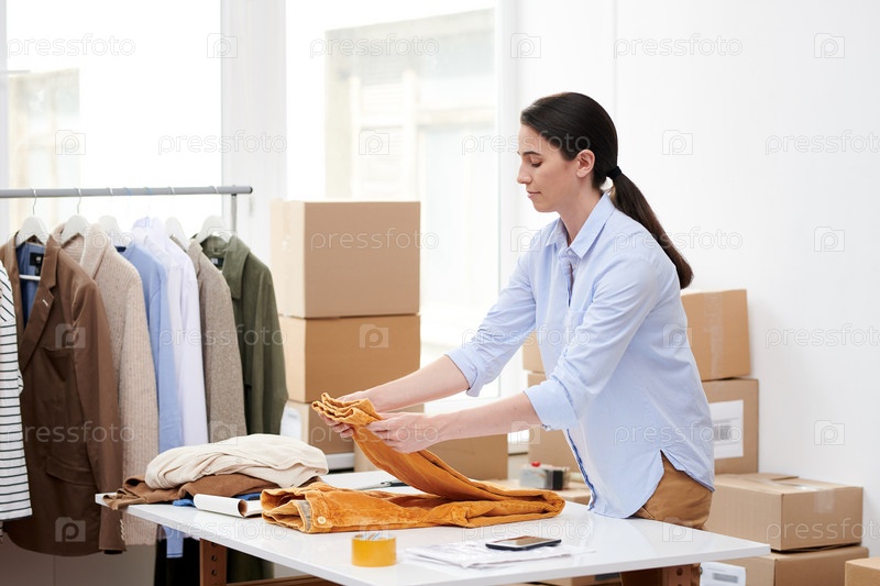 Молодая случайная женщина складывает желтые бархатные брюки на столе