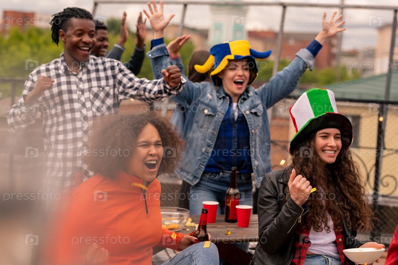 Три счастливых девушки и парень, поддерживающие свою команду во время трансляции на открытом воздухе