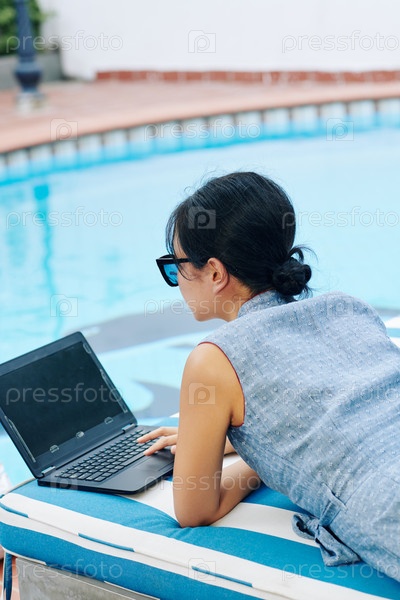 Деловая женщина, работающая на ноутбуке у бассейна