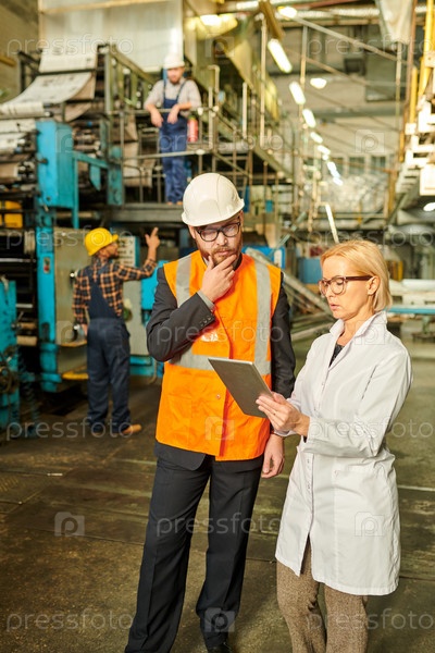 Вдумчивые инспекторы стоят в современном заводском магазине и используют планшет, обсуждая результаты экспертизы
