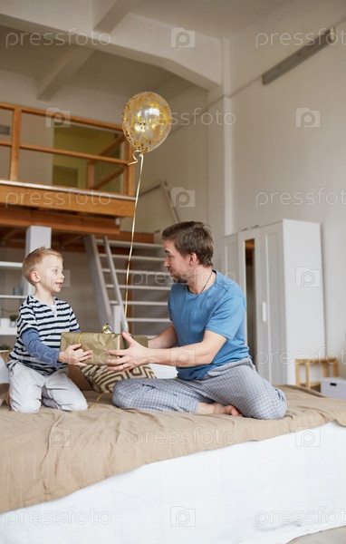 Любящий молодой отец в домашней одежде сидит на кровати и дарит подарок с золотым воздушным шаром своему блондинскому сыну